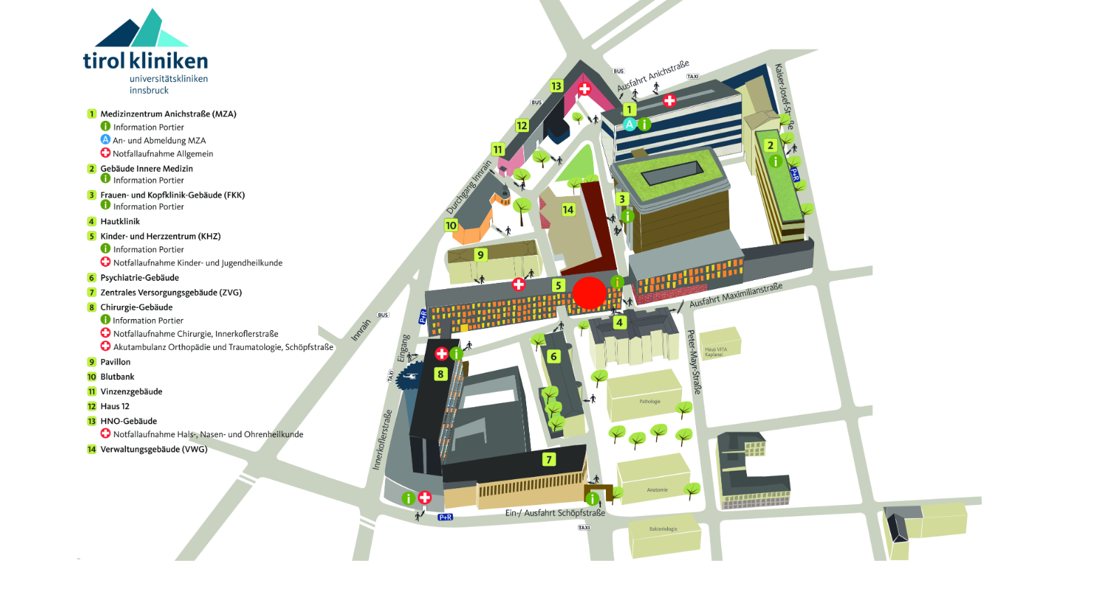 Das Teddybärkrankenhaus findet im Erdgeschoss des Kinder-Herz-Zentrum in Innsbruck statt (roter Punkt). Der Eingang befindet sich links vom Spar.